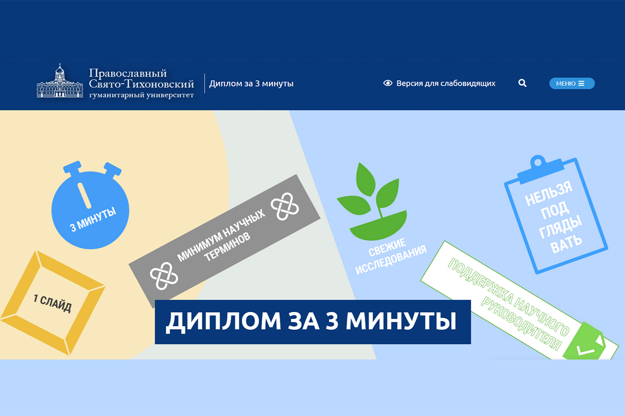 Православный Свято-Тихоновский гуманитарный университет (ПСТГУ) открыл прием заявок на ежегодный конкурс «Диплом за три минуты». К участию приглашаются студенты выпускных курсов ...