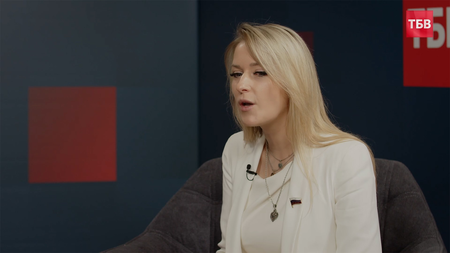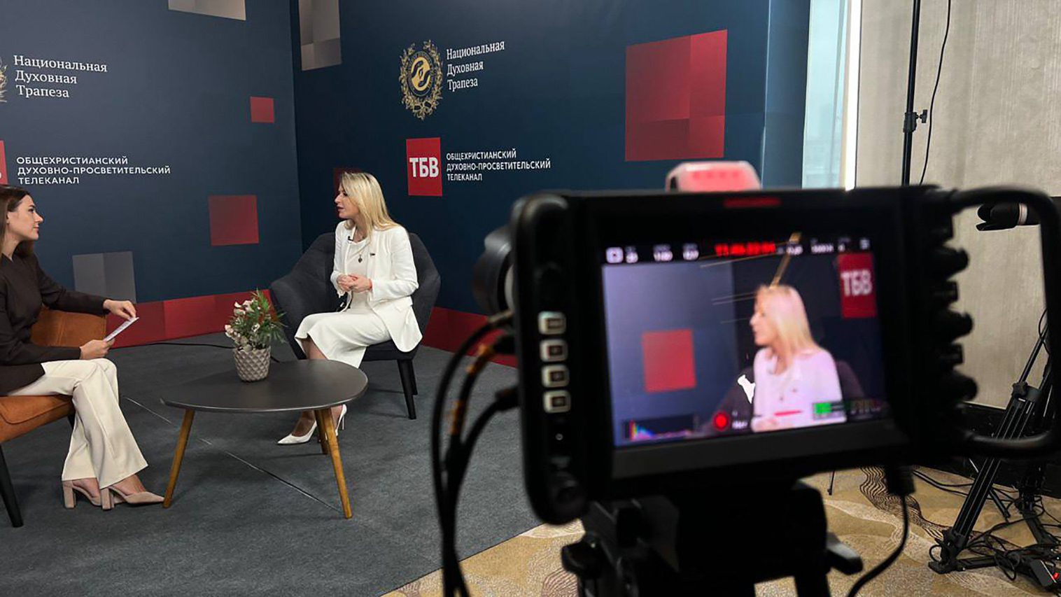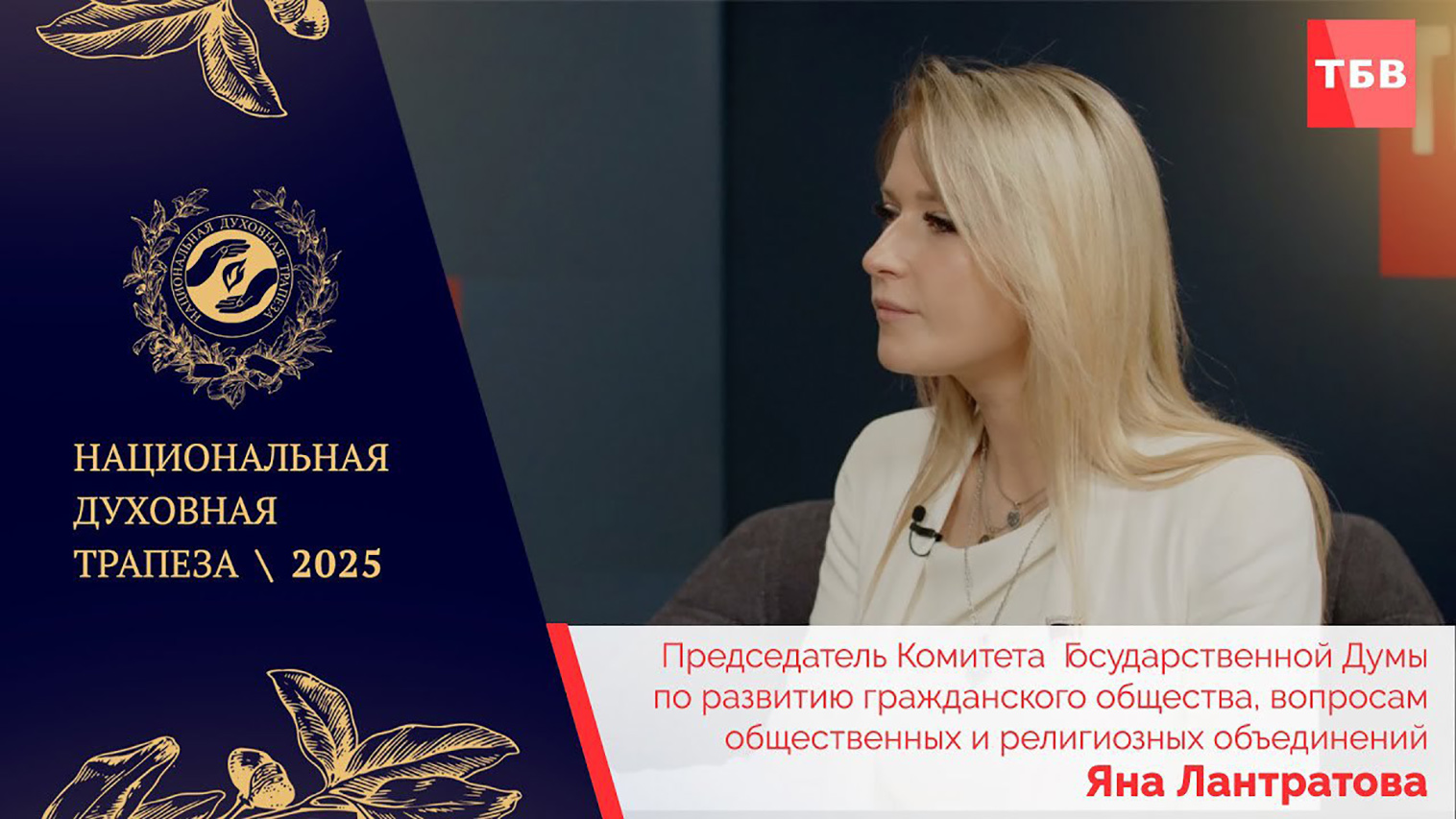 Председатель Комитета Государственной Думы РФ по развитию гражданского общества, вопросам общественных и религиозных организаций Яна Лантратова в студии телеканала ТБВ во время проведения Национальной Духовной Трапезы 11 ноября 2025 года. Тема мероприятия: «Вера и созидание: библейские принципы для строительства сильной России».